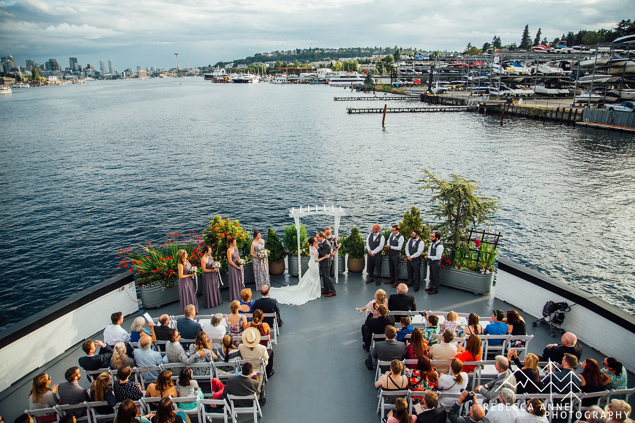 The MV Skansonia is an amazing waterfront venue that used to be a ferry turned into a wedding venue that is permanently docked on North Lake Union with panoramic views of Seattle, Washington. It has vintage nautical decor and award-winning catering. They can accommodate 125 guests with an outdoor ceremony on the bow followed by dinner inside the boat.